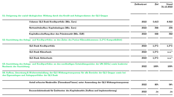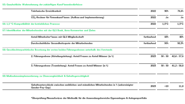 Der Steuerungskreis Nachhaltigkeit entwickelt die GLS Nachhaltigkeitsziele. Diese sind Gegenstand eines kontinuierlichen Steuerungsprozesses. Unter dem Eindruck gestiegener Sensibilisierung für die Relevanz von Nachhaltigkeitsrisiken in Bezug auf Finanzmarktstabilität und Risikogebaren stellen die nicht-finanziellen Ziele eine ergänzende Säule zur Berücksichtigung etwaiger potenzieller Risiken/Chancen zu deren aktiver Steuerung dar.
