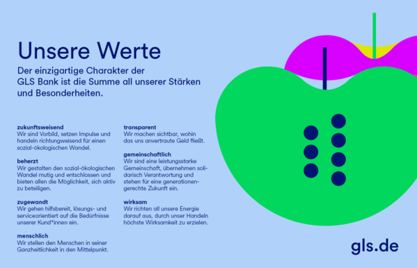 Seit 1974 ist die GLS Bank – Gemeinschaft für Leihen und Schenken – die erste sozial-ökologische Bank Deutschlands. Wir finanzieren nachhaltige Unternehmen, statt an Finanzmärkten zu spekulieren. Wir sind eine Genossenschaftsbank. Denn wir lieben es, Dinge gemeinsam anzugehen. Wir sind Teil eines großen Netzes: Zusammen mit Unternehmen, Organisationen, Verbünden und Aktivist*innen arbeiten wir an einer lebenswerten Zukunft.