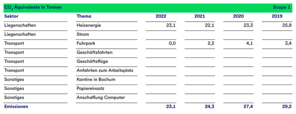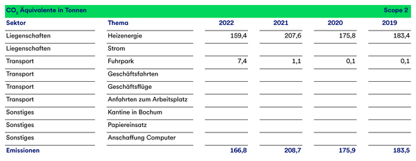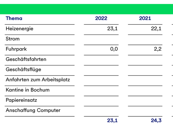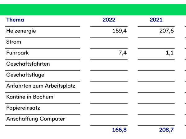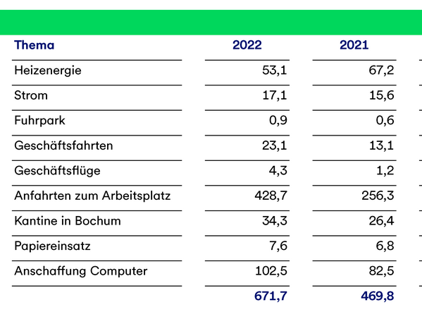 Weitere indirekte Treibhausgasemissionen entstehen bei der Anfahrt der Mitarbeitenden, Dienstreisen, durch den Betrieb eines Casinos am Standort Bochum und durch die Beschaffung von Produkten (hier Papier und Computer). Der Bezug von Strom führt ebenfalls zu Scope 3 Emissionen (aufgrund der Stromerzeugung und durch Verluste im Leitungsnetz).