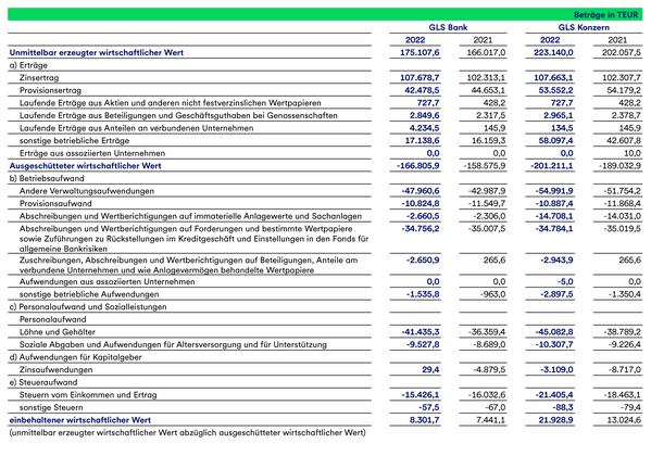 Dieser Indikator beziffert den unmittelbar erzeugten und ausgeschütteten wirtschaftlichen Wert einer Periode. Der Wert ergibt sich aus den handelsrechtlichen Gewinn- und Verlustrechnungen der GLS Bank und des GLS Konzerns für das Geschäftsjahr 2022.