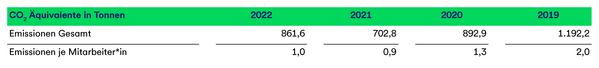 Der systematischen Vorgehensweise des SCC Standards folgend werden die Emissionen von Treibhausgasen nach international anerkannten Verfahren analysiert und berechnet. Die betrieblichen Emissionen des GLS Konzerns betragen danach 861,6 Tonnen CO2-Äquivalente (Vorjahr 702,8 Tonnen). Bezogen auf die durchschnittliche Zahl der Mitarbeiter*innen sind dies 1,0 Tonnen CO2 (Vorjahr 0,9 Tonnen CO2). Diese Emissionen werden durch Investitionen in hochwertige Klimaschutzprojekte kompensiert.